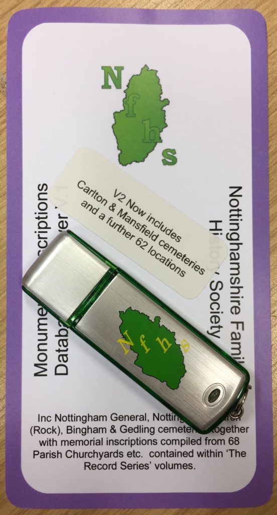 Version 2 of the Society’s Monumental Inscription database is now available on Flash Drive. 64 locations have been added – including churches, churchyards, war memorials, cemeteries and transcriptions of Nottinghamshire Archives documents.